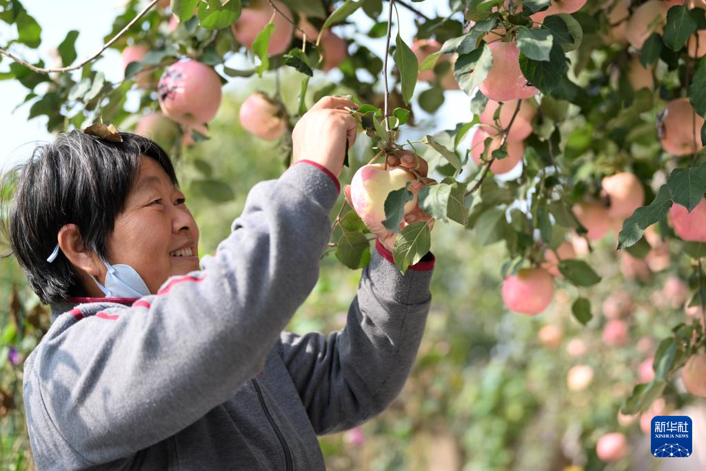 10月12日,在天津市蓟州区马伸桥镇育英洼村,村民在采摘苹果。