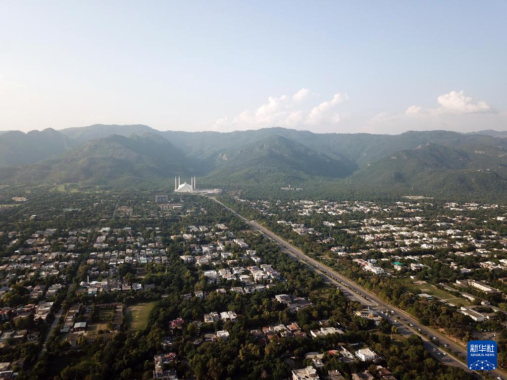 这是在巴基斯坦首都伊斯兰堡拍摄的默尔加拉山和坐落在山脚下的标志性建筑——费萨尔清真寺(无人机照片,10月8日摄)。