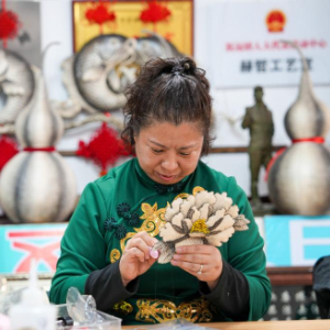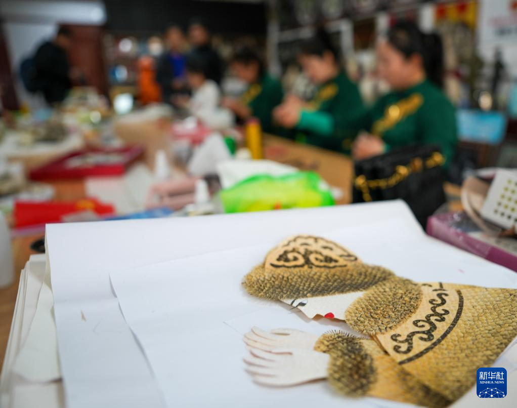 10月12日,在黑龙江省佳木斯抚远市米比赫哲工艺室,学员在进行鱼皮文创产品制作。