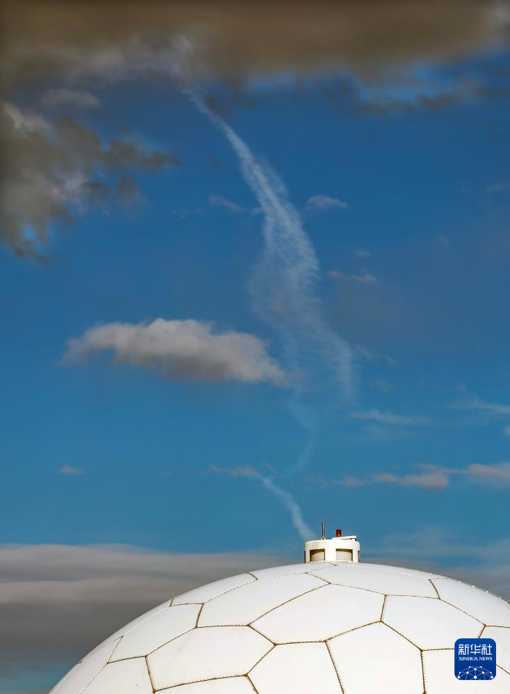 10月11日在黑龙江佳木斯气象卫星地面站拍摄的卫星数据接收天线。