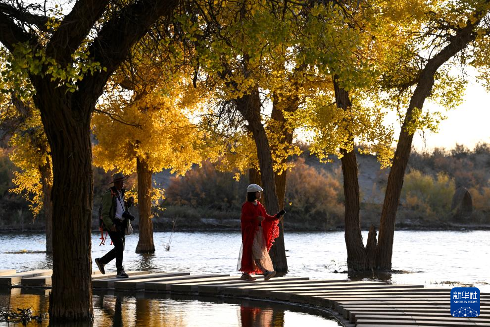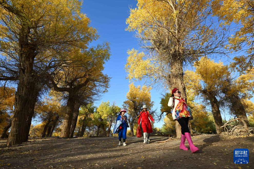 10月13日,游客在内蒙古阿拉善盟额济纳旗额济纳胡杨林旅游区游玩。