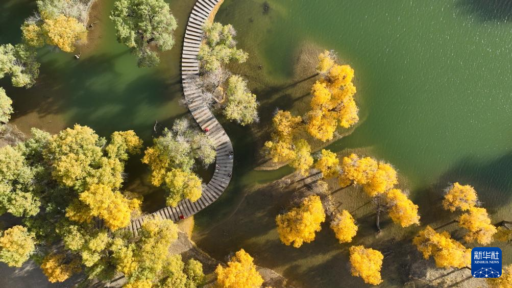 10月13日,游客在内蒙古阿拉善盟额济纳旗额济纳胡杨林旅游区游玩(无人机照片)。