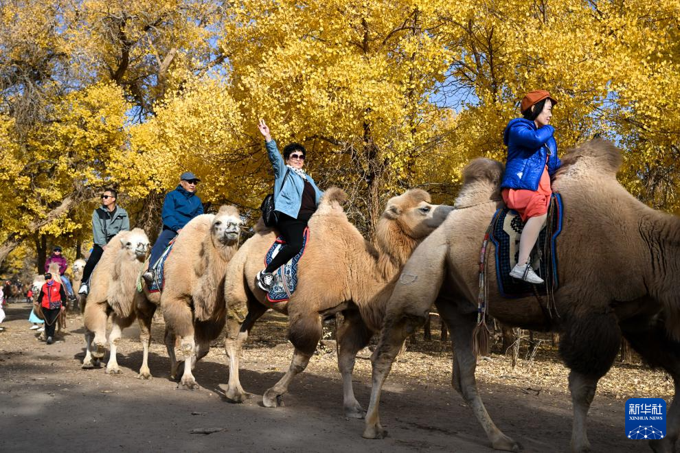10月13日,游客在内蒙古阿拉善盟额济纳旗额济纳胡杨林旅游区骑骆驼。