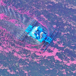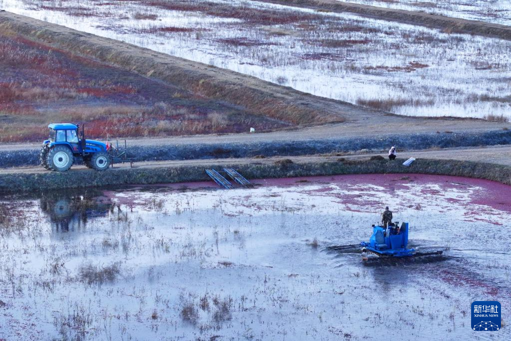 10月11日,在黑龙江省抚远市蔓越莓种植基地,工作人员在在水中采收蔓越莓。