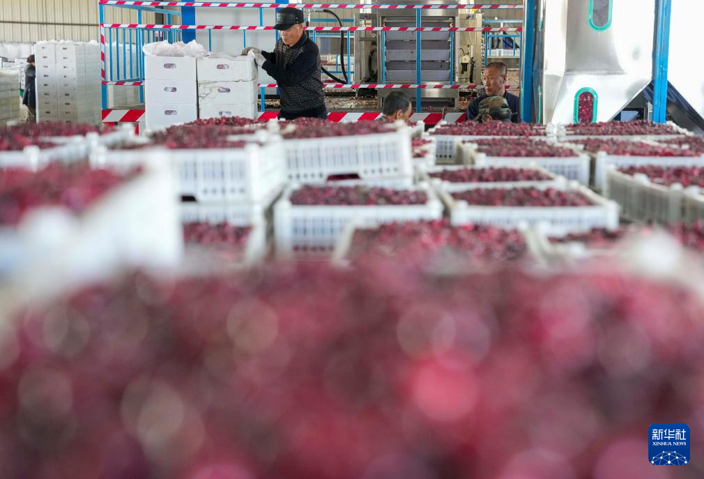 10月11日,在黑龙江省抚远市蔓越莓种植基地分拣车间,工作人员在进行分拣作业。