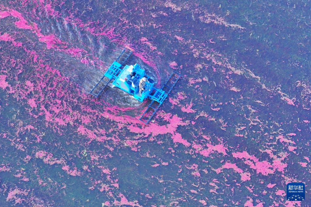 10月11日,在黑龙江省抚远市蔓越莓种植基地,工作人员在水中采收蔓越莓。