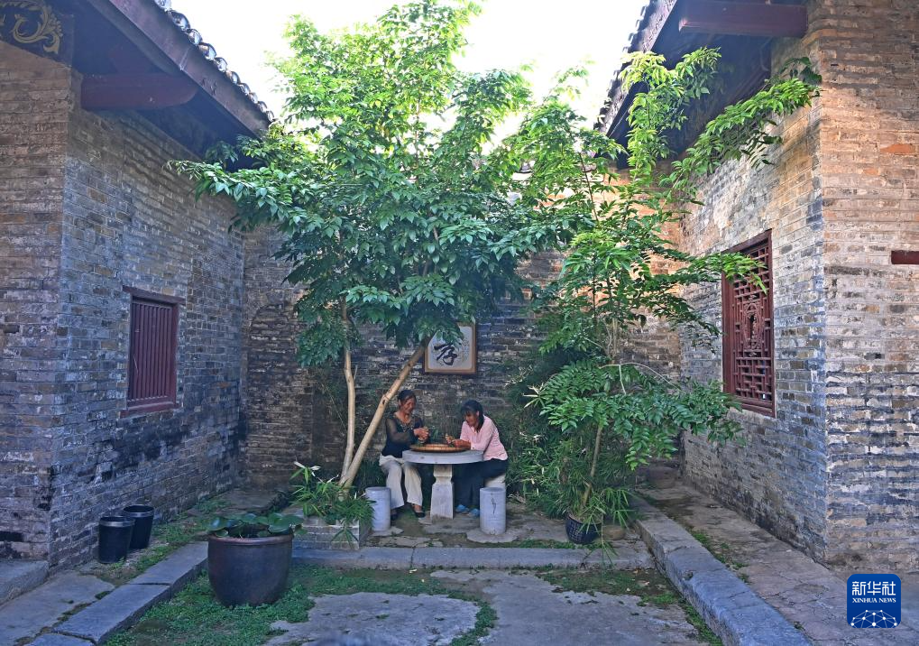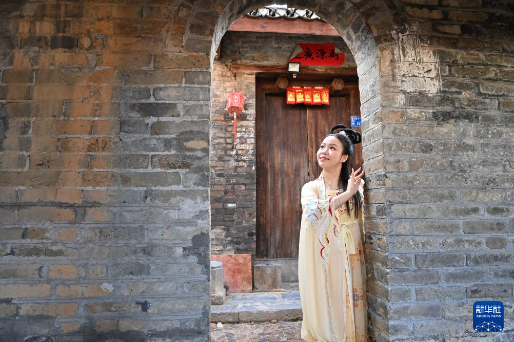 两名游客在广西来宾市象州县罗秀镇纳禄村的古宅里翩翩起舞(10月10日摄)。