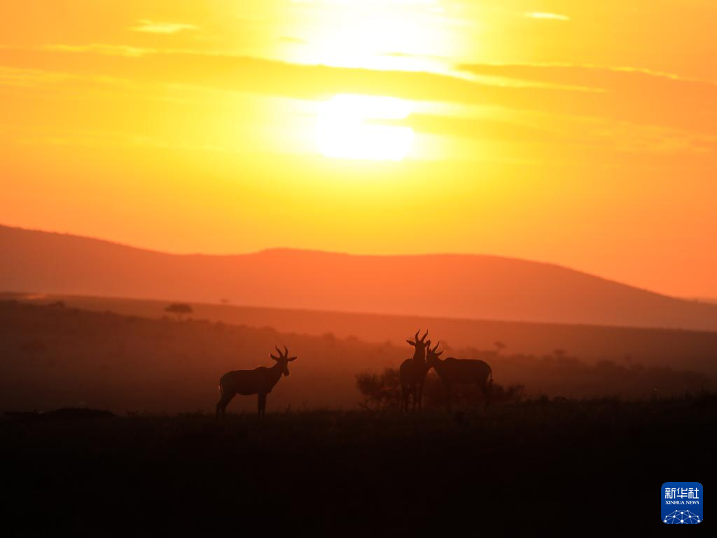 这是10月12日在肯尼亚马赛马拉国家保护区拍摄的落日景色。