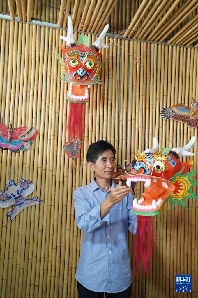 10月14日,在山东省潍坊市寒亭区,风筝制作技艺非遗传承人郭洪利在展示传统龙头风筝。