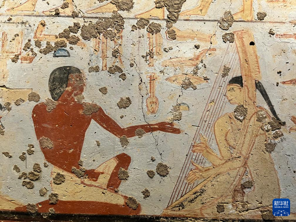 这是10月15日在埃及吉萨的大埃及博物馆展厅拍摄的壁画。