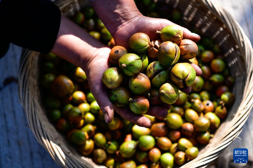 10月15日,村民在龙里县颐光山林油茶生态园晾晒油茶果。