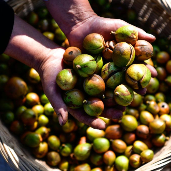 10月15日,村民在龙里县颐光山林油茶生态园展示新采摘的油茶果。