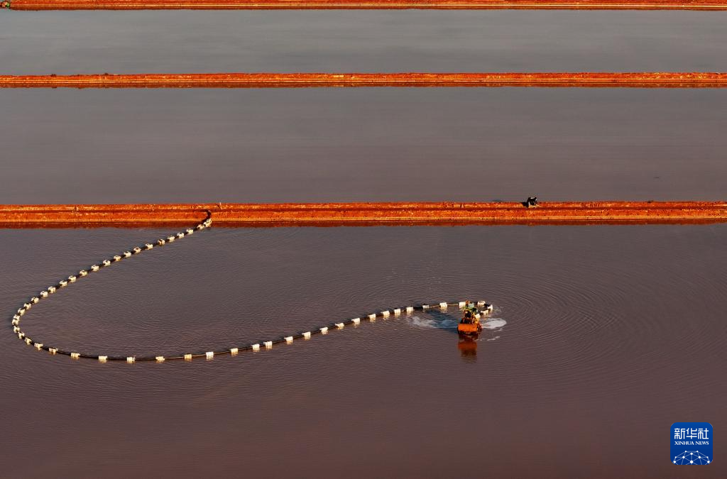 10月16日,工人在河北省唐山市曹妃甸区南堡盐场操作推船运输秋盐(无人机照片)。