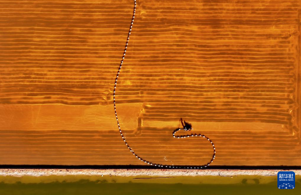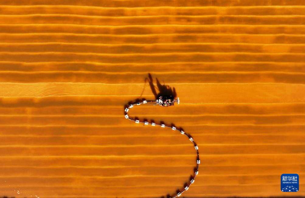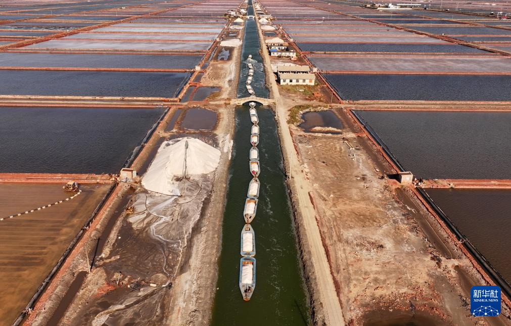 时下正值秋盐收获季,河北省唐山市曹妃甸区南堡盐场的工人利用晴好天气抢收秋盐,“百里盐池”呈现出一片繁忙景象。