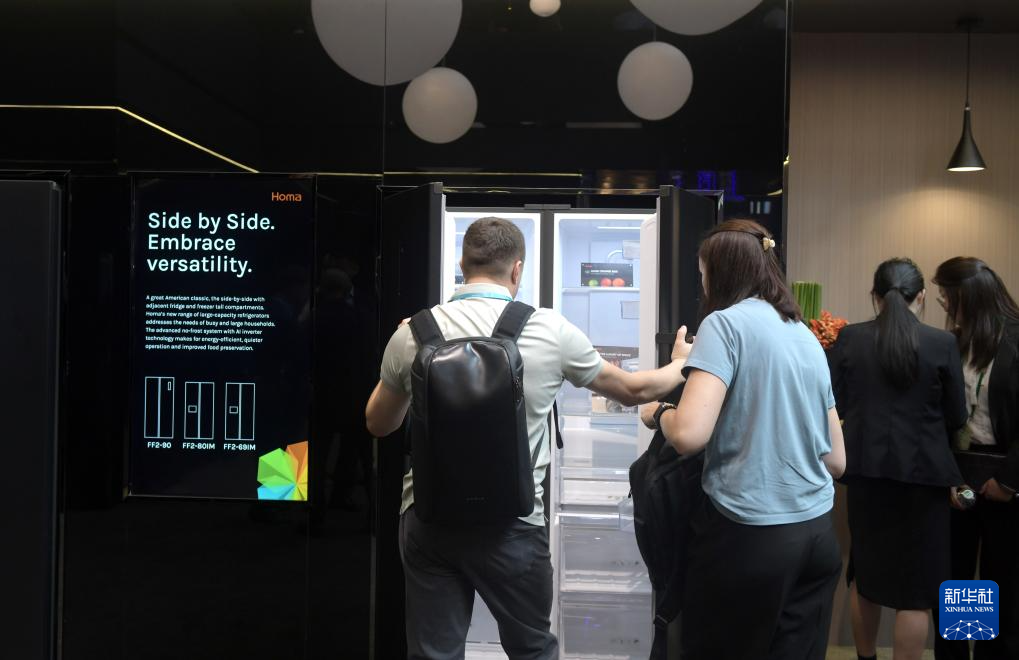 10月15日,客商在广交会上参观选购一款节能冰箱。