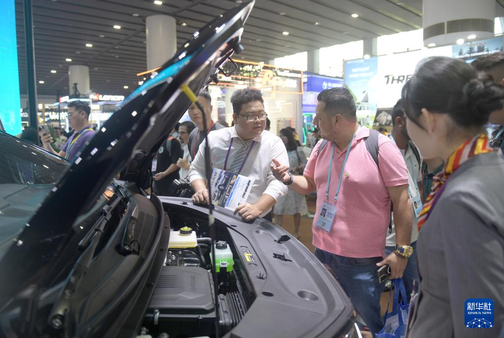 10月15日,客商在广交会上参观了解一款新能源汽车。