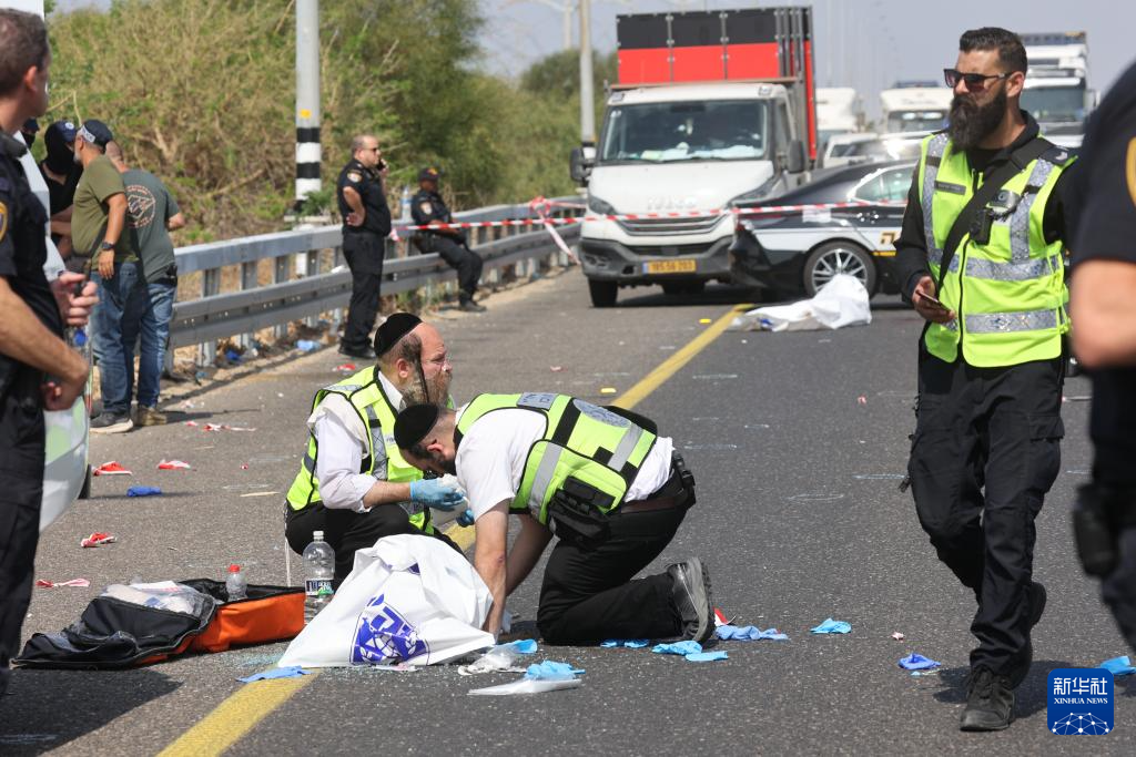 10月15日,在以色列南部城市阿什杜德附近,安全人员处理枪击事件现场。