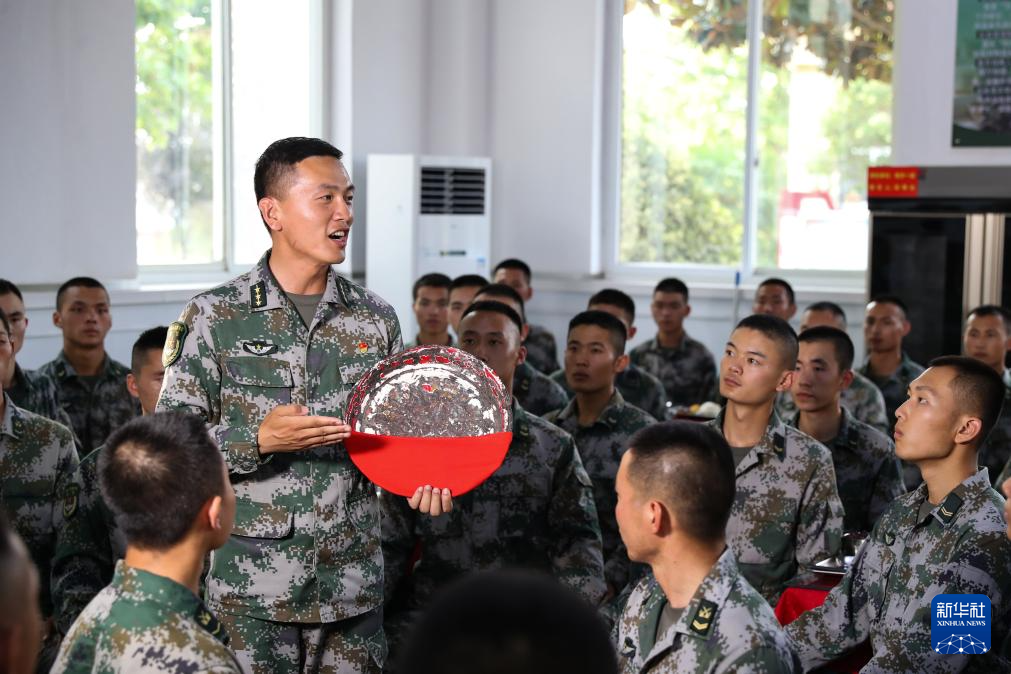 陆军第83集团军某旅“红一连”指导员郑纪文为官兵讲述连队传家宝“红菜盘”背后的故事(2021年6月13日摄)。