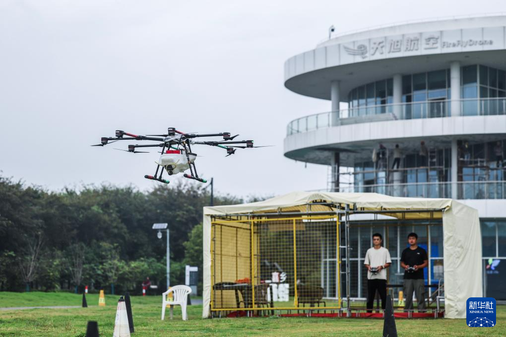 10月16日,在南湖区凤桥镇永红村的天旭航空培训基地内,无人机爱好者测试无人机。
