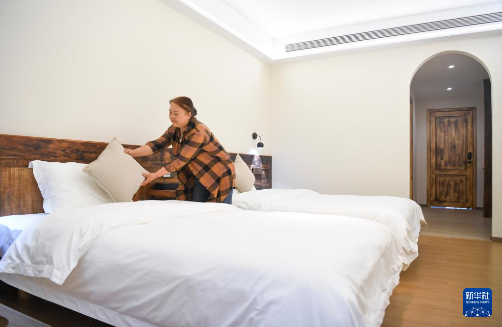 10月15日,重庆市北碚区澄江镇缙云村一家民宿的工作人员在整理客房。