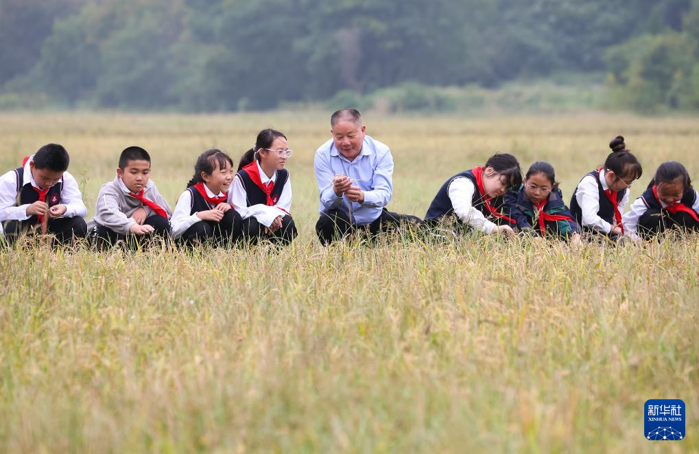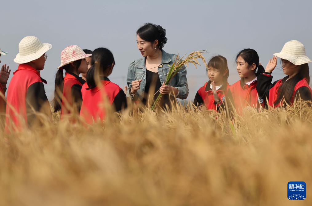 10月16日,山东省临沂市沂南县张庄镇中心小学的学生在老师的带领下学习水稻知识。