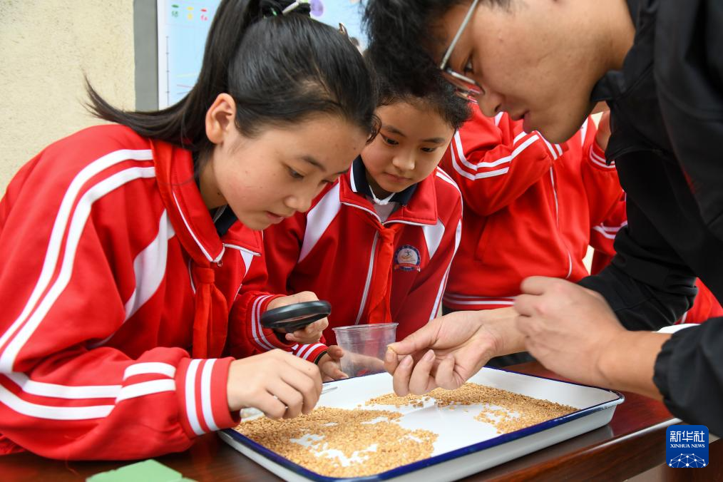 10月16日,在四川省阆中市,小学生在四川省储备粮集团阆中储备库工作人员的指导下学习挑选小麦中的不完善粒。