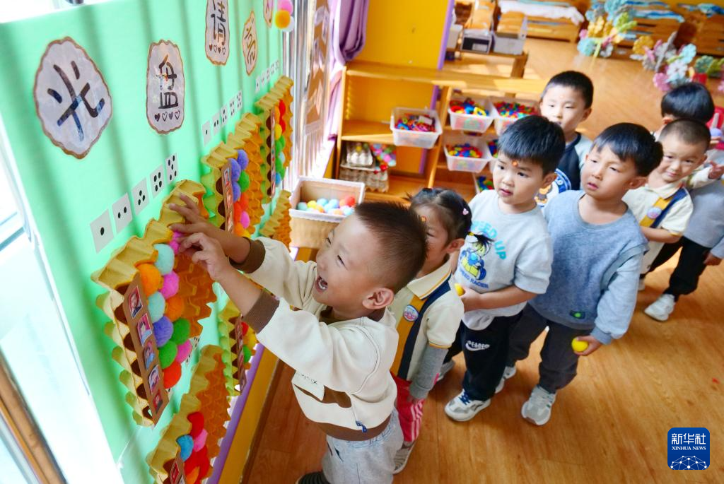 10月16日,山东省滨州市惠民县淄角镇实验幼儿园开展午餐“光盘亮灯”活动,孩子们在午餐光盘后,把一颗象征灯的小球放在空格内。