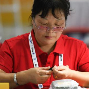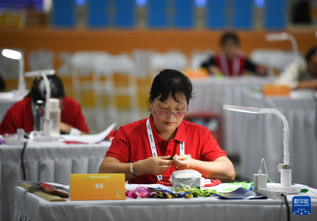 10月16日,参赛选手在陕西省2024职业技能大赛手工绣赛项比赛中。