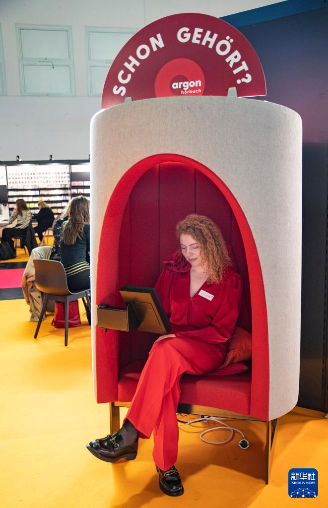 10月16日,一名女子在德国法兰克福书展上体验有声书。