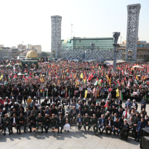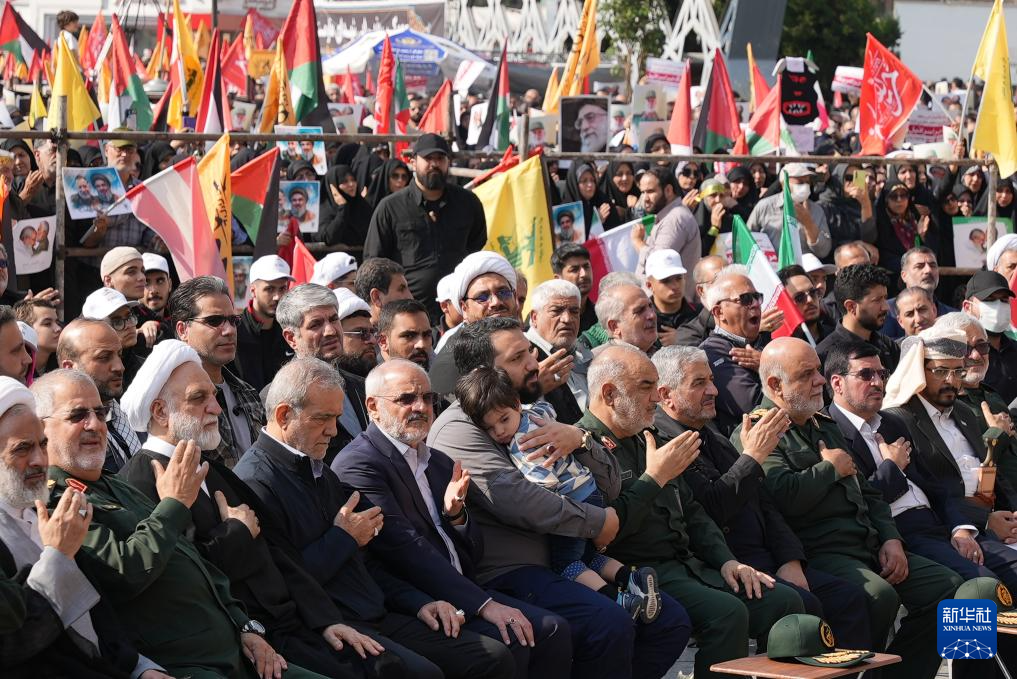 10月15日,在伊朗首都德黑兰,伊朗总统佩泽希齐扬(前排左四)等参加为伊斯兰革命卫队高级指挥官阿巴斯·尼尔福鲁尚举办的葬礼。新华社记者 沙达提 摄