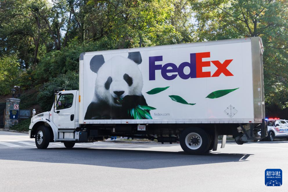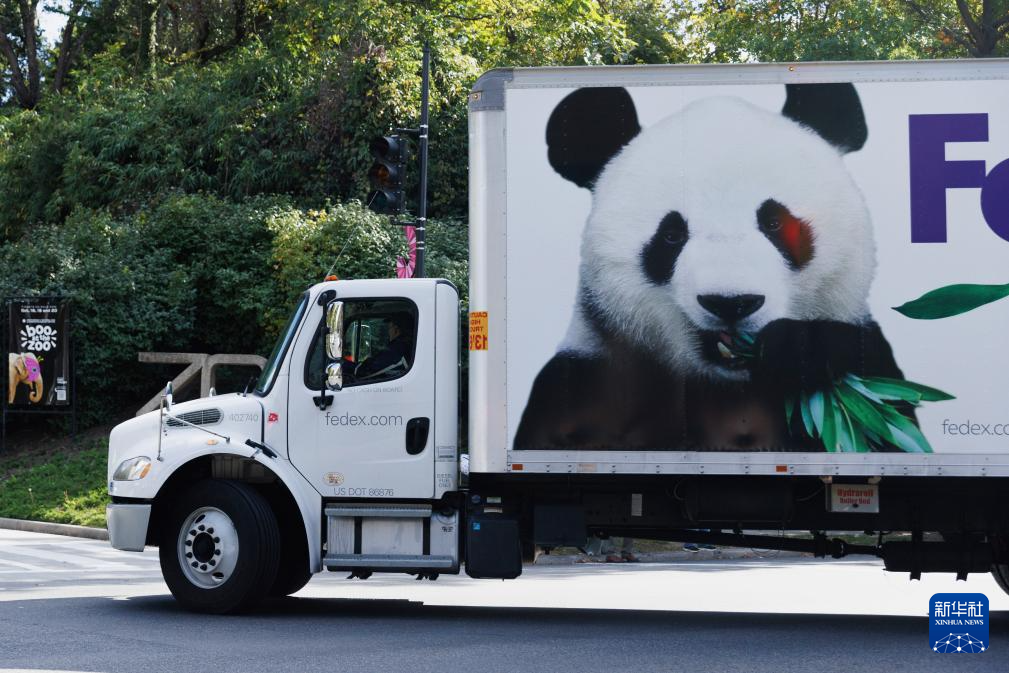 10月15日,在美国首都华盛顿 ,运送大熊猫的卡车即将驶入华盛顿国家动物园。