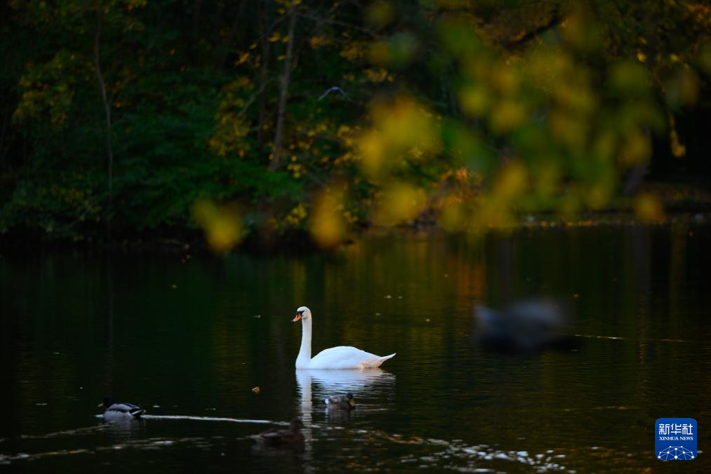 这是10月16日在波兰首都华沙的瓦津基公园内拍摄的天鹅和鸭子。