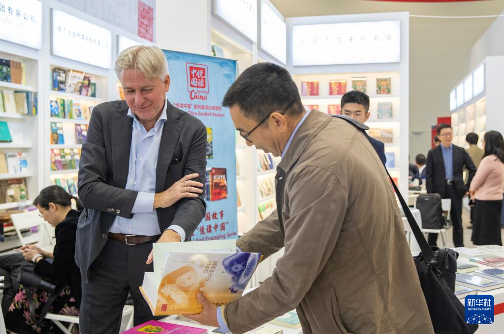 10月16日,法兰克福书展主席于尔根·博斯(左)在德国法兰克福书展中国联合展台浏览《中国年鉴》。