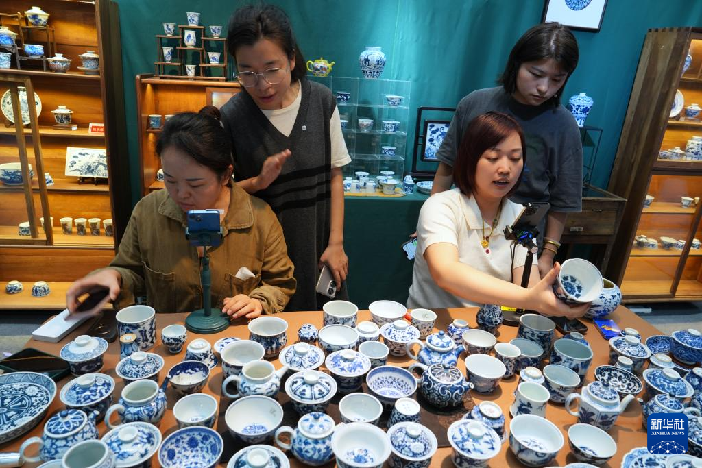 10月18日,参展商在2024中国景德镇国际陶瓷博览会现场使用网络进行推广。