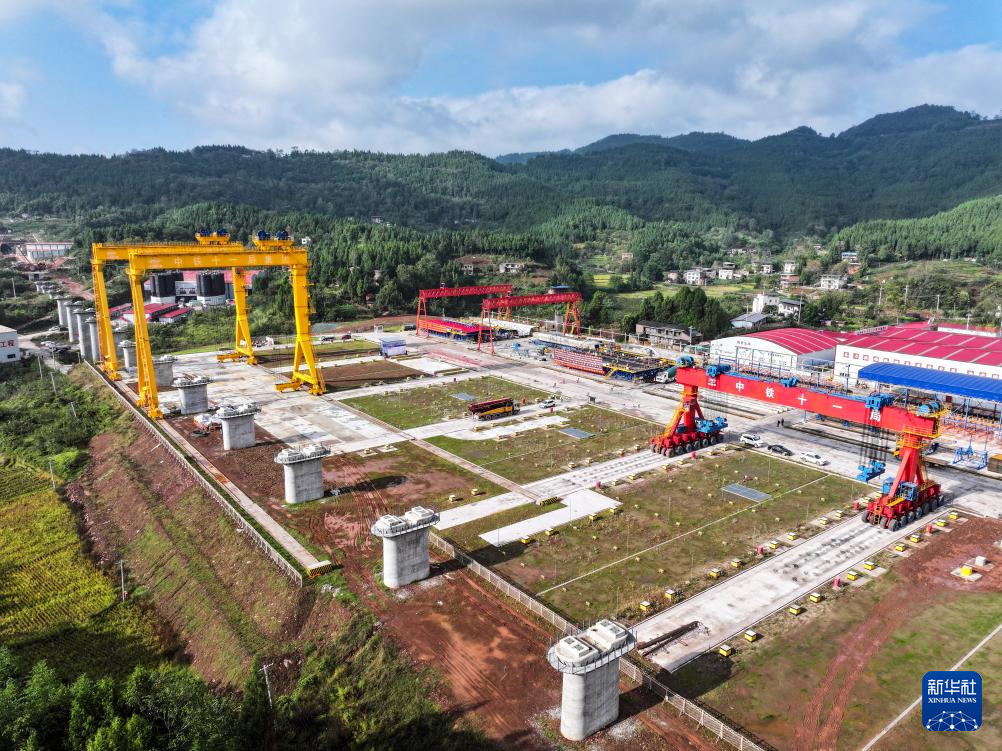 这是10月18日拍摄的建设中的渝万高铁龙颈湾双线特大桥及中铁十一局渝万高铁万州响水镇制梁场(无人机照片)。