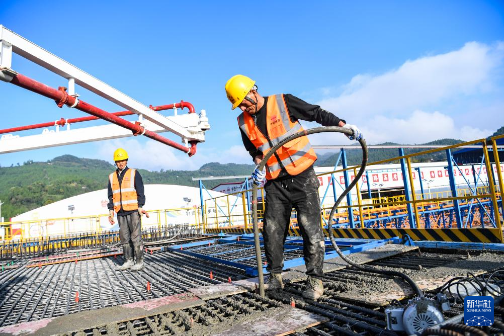 10月18日,在中铁十一局渝万高铁万州响水镇制梁场,工人在进行预制箱梁浇筑作业。