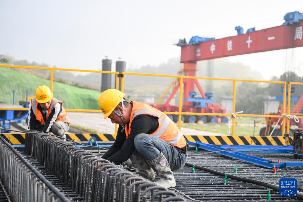 10月18日,工人在中铁十一局渝万高铁万州响水镇制梁场作业。