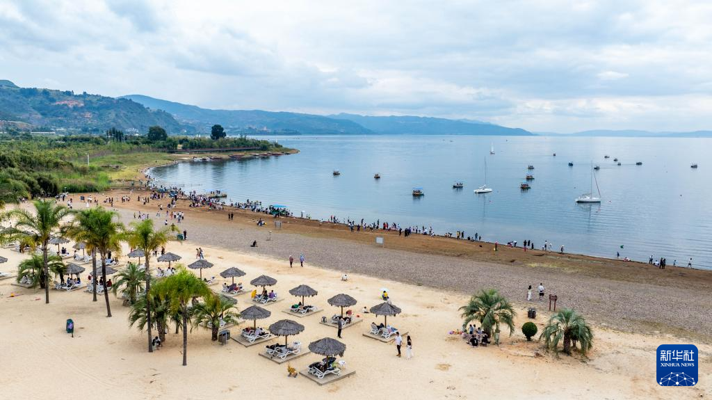游人在抚仙湖边的沙滩上休闲、游玩(无人机照片,10月5日摄)。