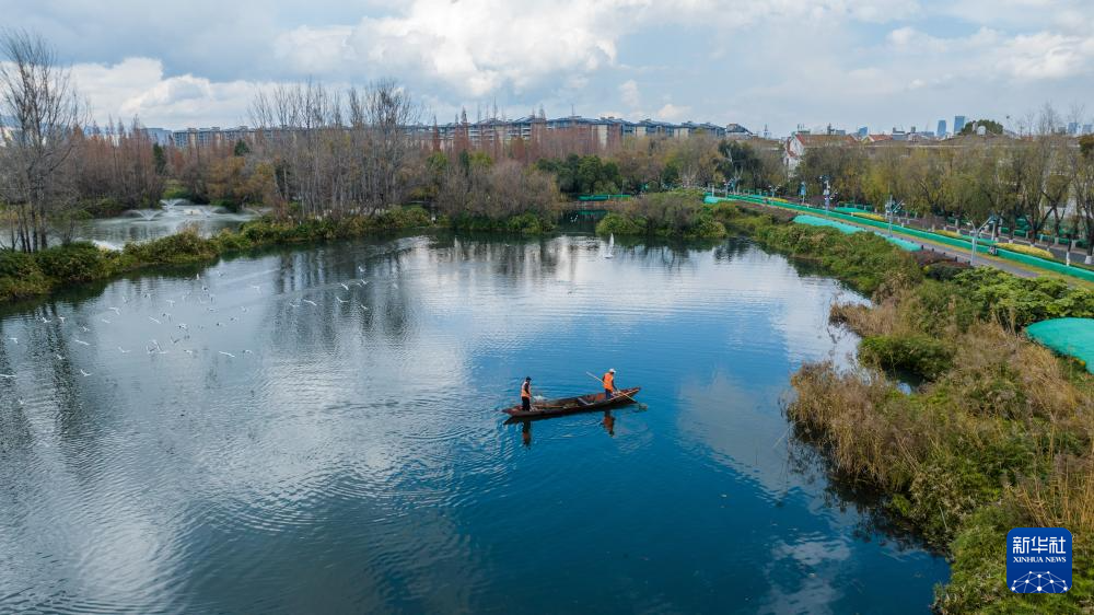 管护人员在滇池打捞杂物(无人机照片,1月16日摄)。