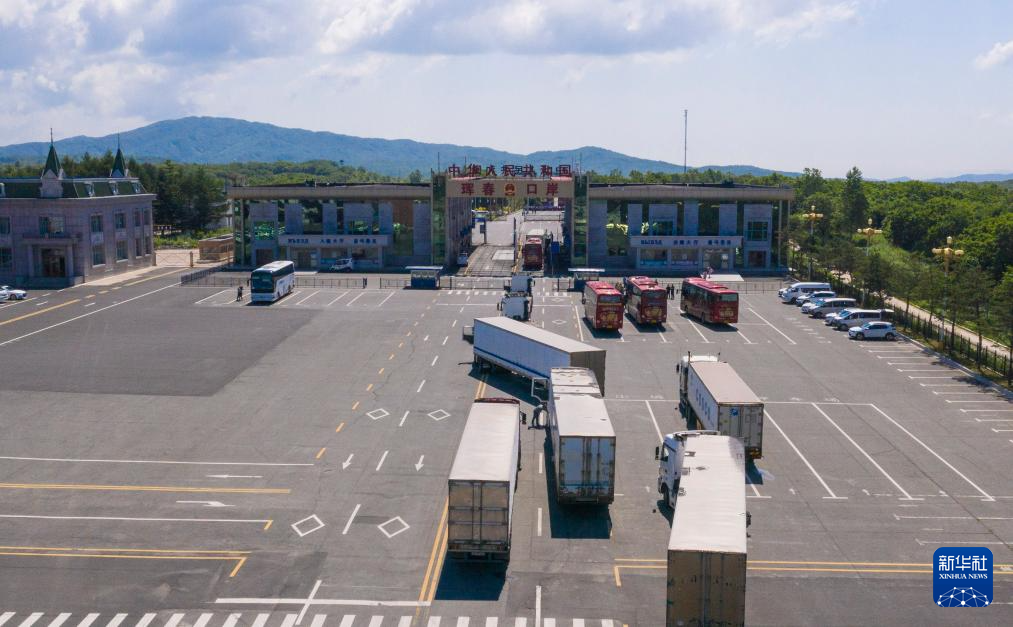 2019年6月22日,往返于中国和俄罗斯的货车在中俄珲春口岸前排队等待通关(无人机照片)。