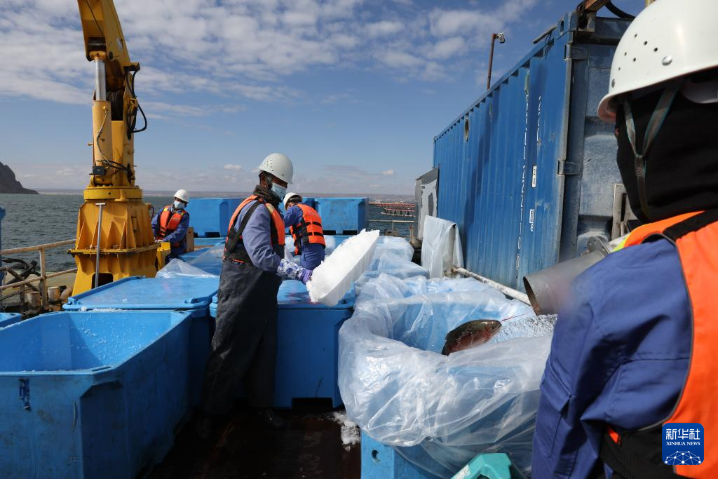 10月18日,龙洋知鲜(青海)股份有限公司员工给冷水鱼加冰块保鲜。
