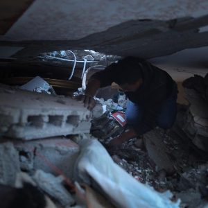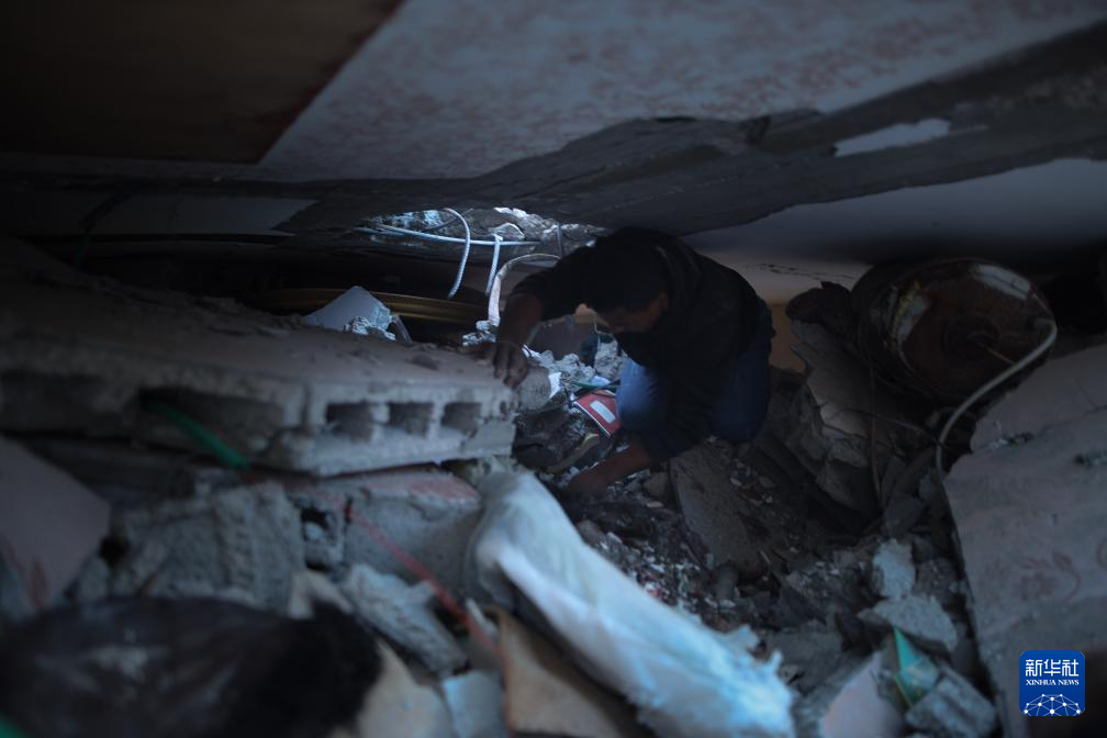 10月19日,在加沙地带迈加齐难民营,巴勒斯坦人在以军轰炸后的废墟中搜寻幸存者。