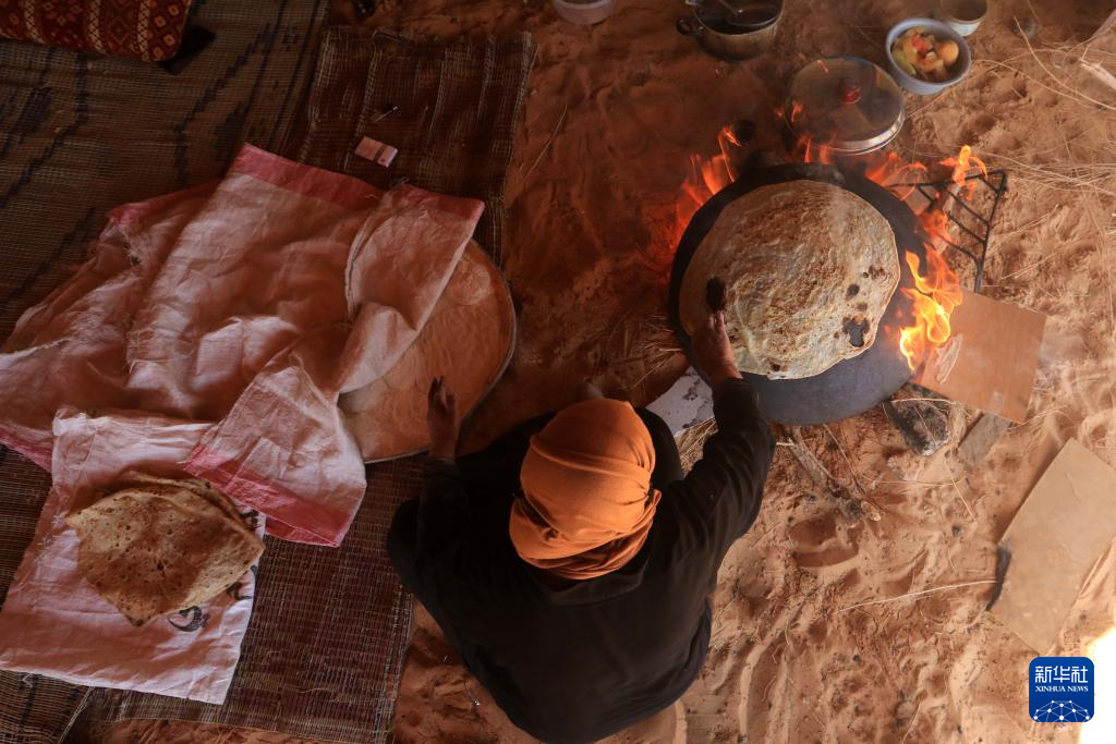10月11日,在约旦瓦迪拉姆,贝都因人阿卜杜拉·苏莱曼的妻子在准备食物。