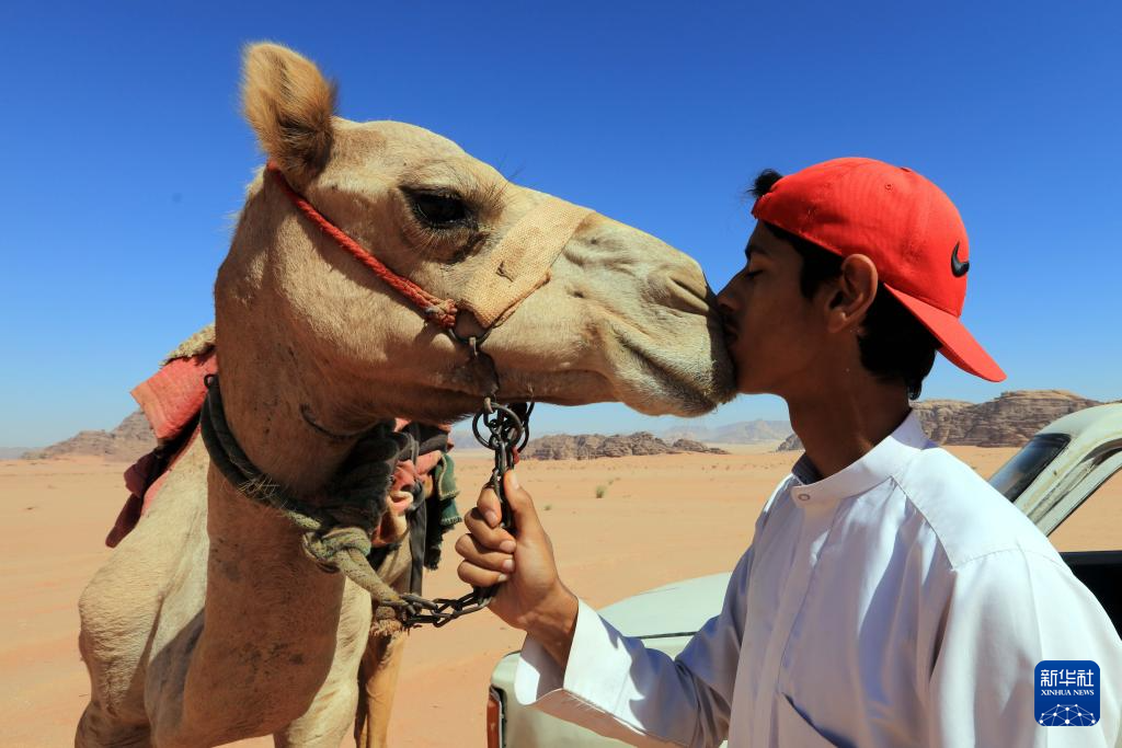 10月11日,在约旦瓦迪拉姆,一名贝都因人亲吻骆驼。