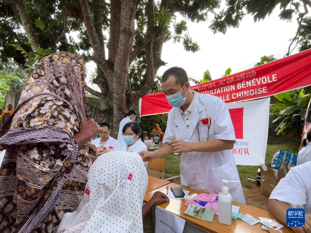 10月21日,在科摩罗莫埃利岛,中国医疗队队员为当地居民义诊。