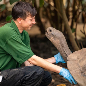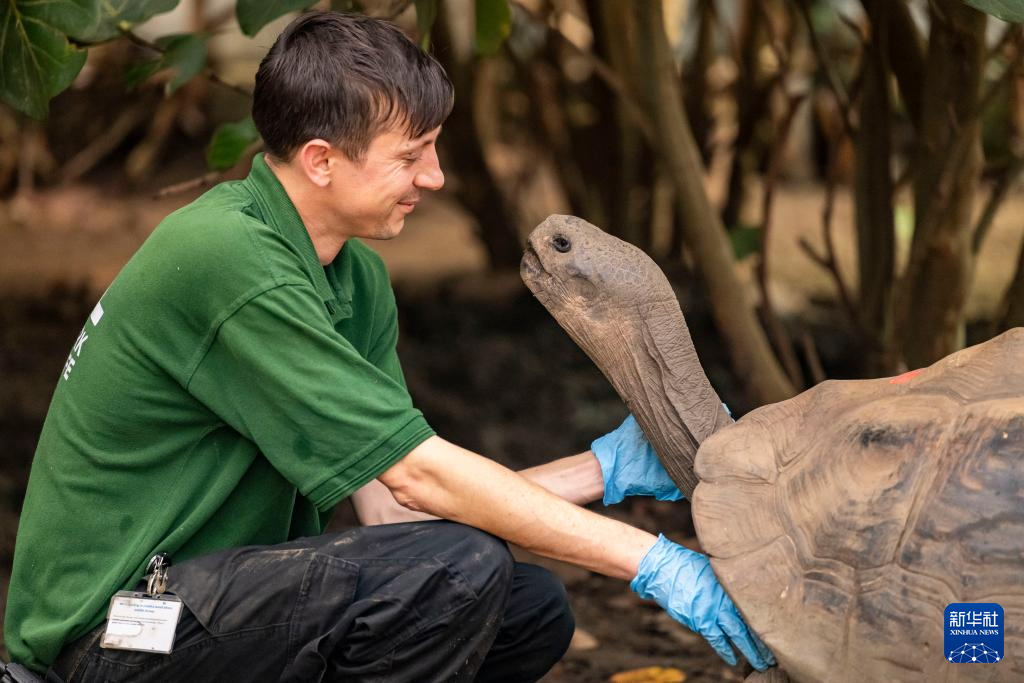 10月21日,在英国伦敦动物园,工作人员为一只124公斤重的加拉帕戈斯象龟称重后与它互动。
