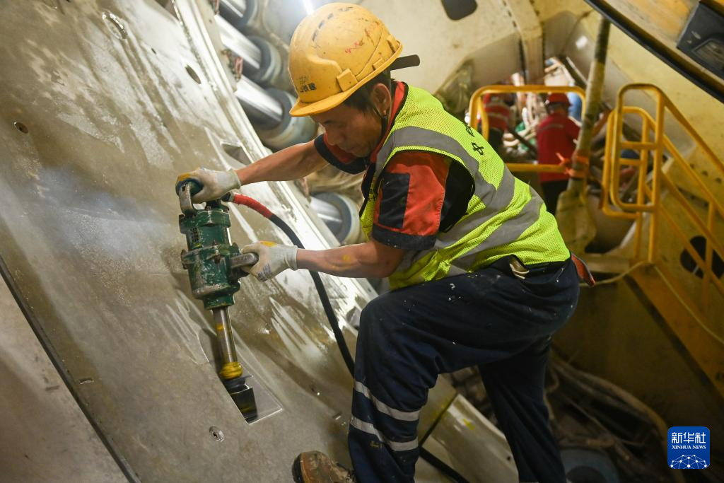 10月22日,中铁十一局技术人员在甬舟铁路金塘海底隧道“定海号”盾构机内作业。