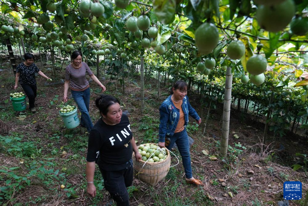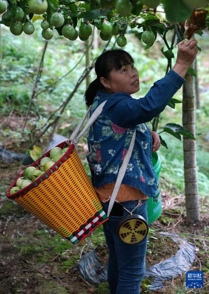 10月22日,在广西龙胜各族自治县龙脊镇岳武村,村民在采摘百香果。