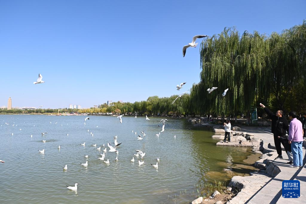 10月22日,人们在银川市海宝公园观赏红嘴鸥。