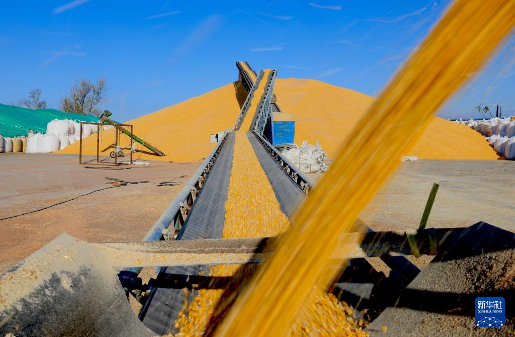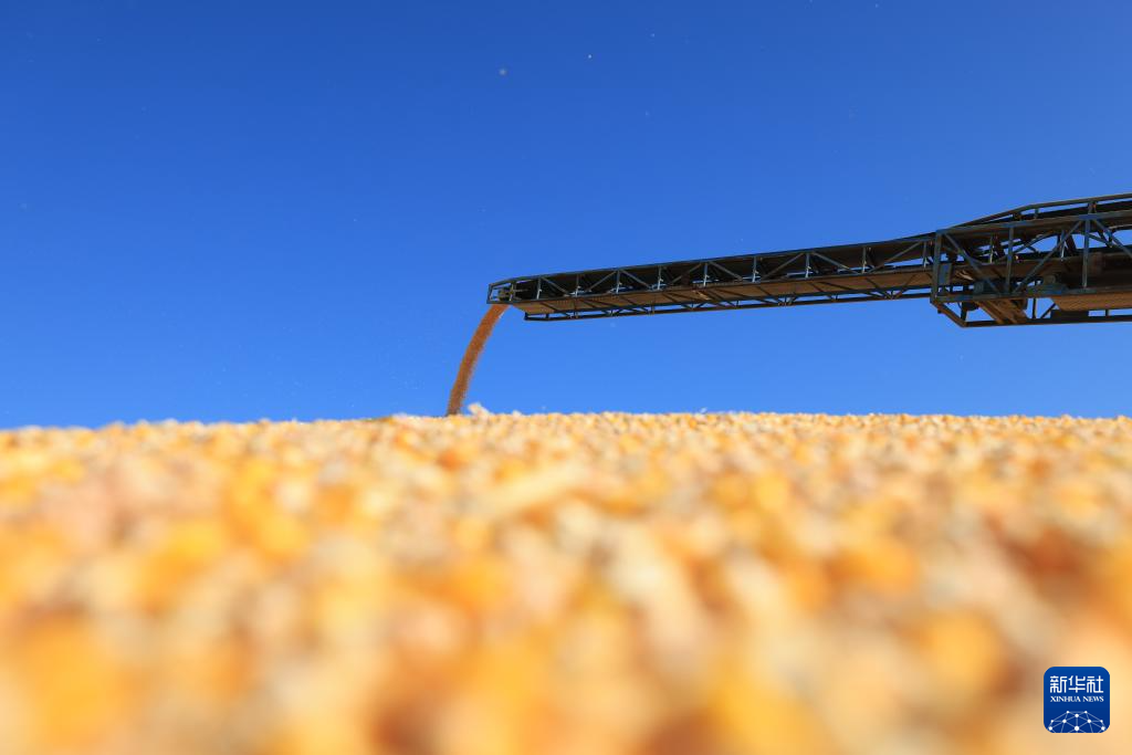10月23日,在北大荒集团北安分公司长水河农场有限公司第三管理区晒场,烘干的玉米被传送到粮堆。